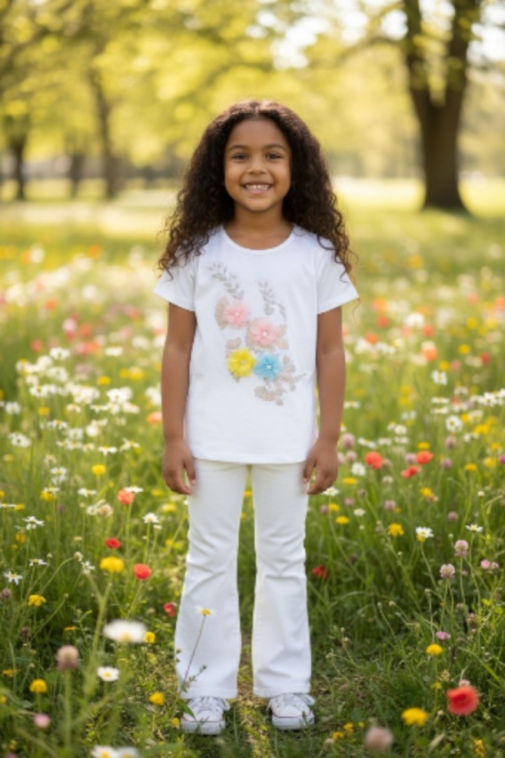 Bawełniana bluzka z krótkim rękawem i dekoracyjną aplikacją z kwiatami 3D i haftem na przodzie. Wykonana z przyjemnej i elastycznej bawełny z niewielką domieszką elastanu dzięki której dobrze się naddaje.