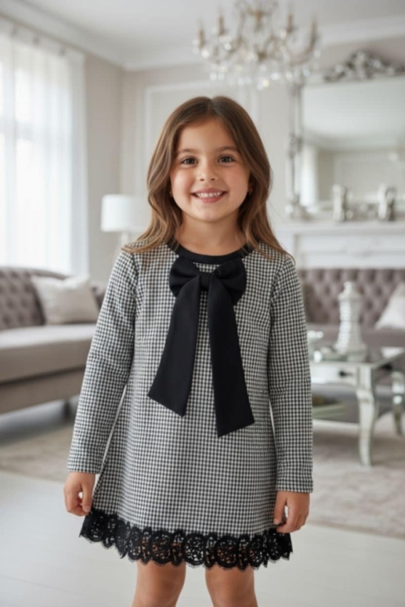 • Okolicznościowa sukienka PEPITKA z kokardą na przodzie