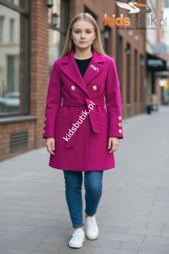 Płaszczyk flauszowy przejściowy z ozdobną broszką wiosna/jesień - fuksja