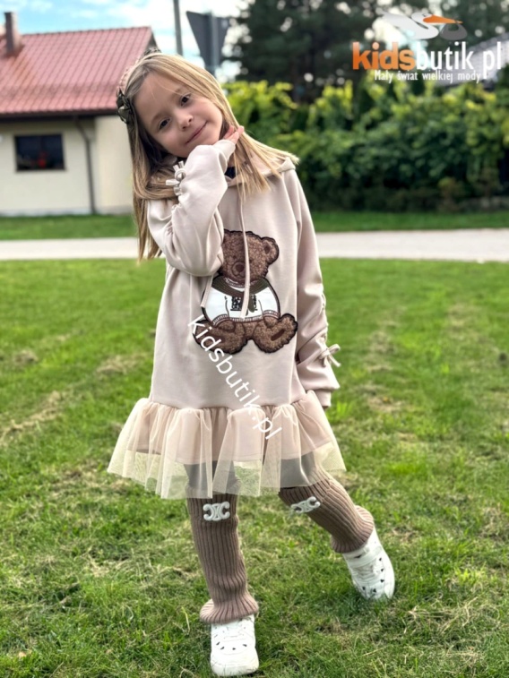 Bawełniania sukienka w wygodnym trapezowym fasonie z przyszywaną, ozdobną aplikacją Misia na przodzie, kapturem ze ściągaczem, ściąganymi rękawami i tiulową falbanką u dołu.