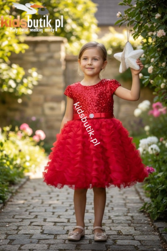 Elegancka sukienka uszyta z miękkiego i naddającego się welurku z błyszczącymi cekinami u góry i poziomą kaskadą z mnóstwa tiulowych falbanek na spódnicy. W pasie przepasana satynową wstążką z ozdobną kokardą i kwiatowym diamentem w środku. Od wewnątrz podszyta w całości podszyta welurową podszewką, dzięki której nic nie drapie i nie gryzie. Z tyłu na całej długości pleców zapinana na zamek błyskawiczny i wiązana na kokardę.